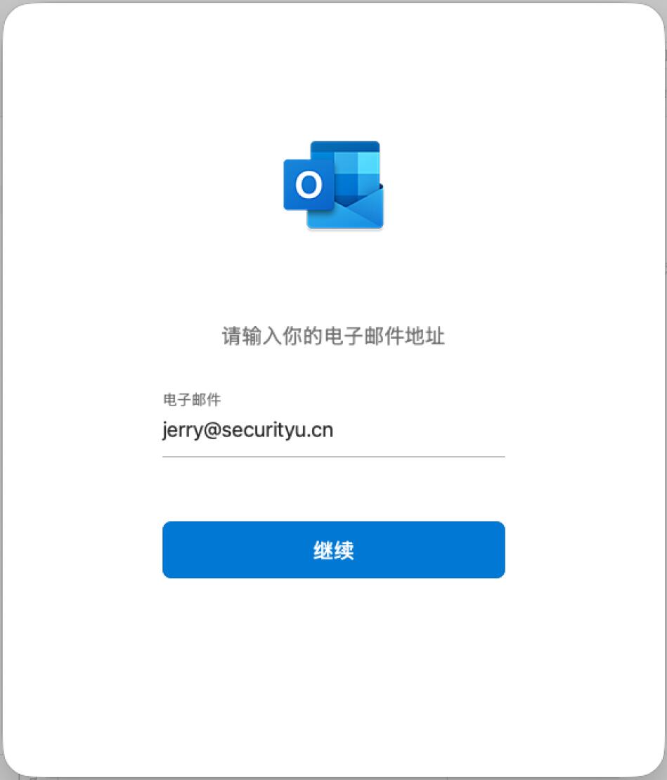 1、打开Microsoft Outlook应用程序,在添加邮箱帐户窗口中,[电子邮件]填写邮箱地址,并点击[继续]。