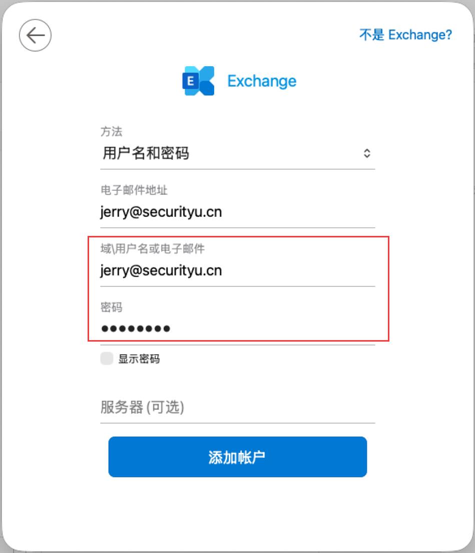 2、填写[域\用户名或电子邮件]和[密码],并点击[添加帐户]。