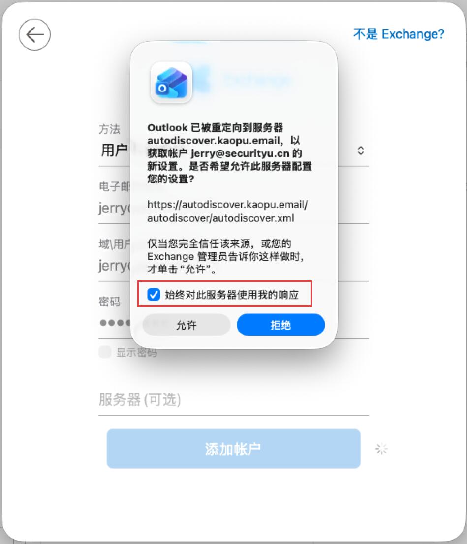 3、在弹出的重定向到服务器窗口,勾选[始终对此服务器使用我的响应],并点击[允许]。