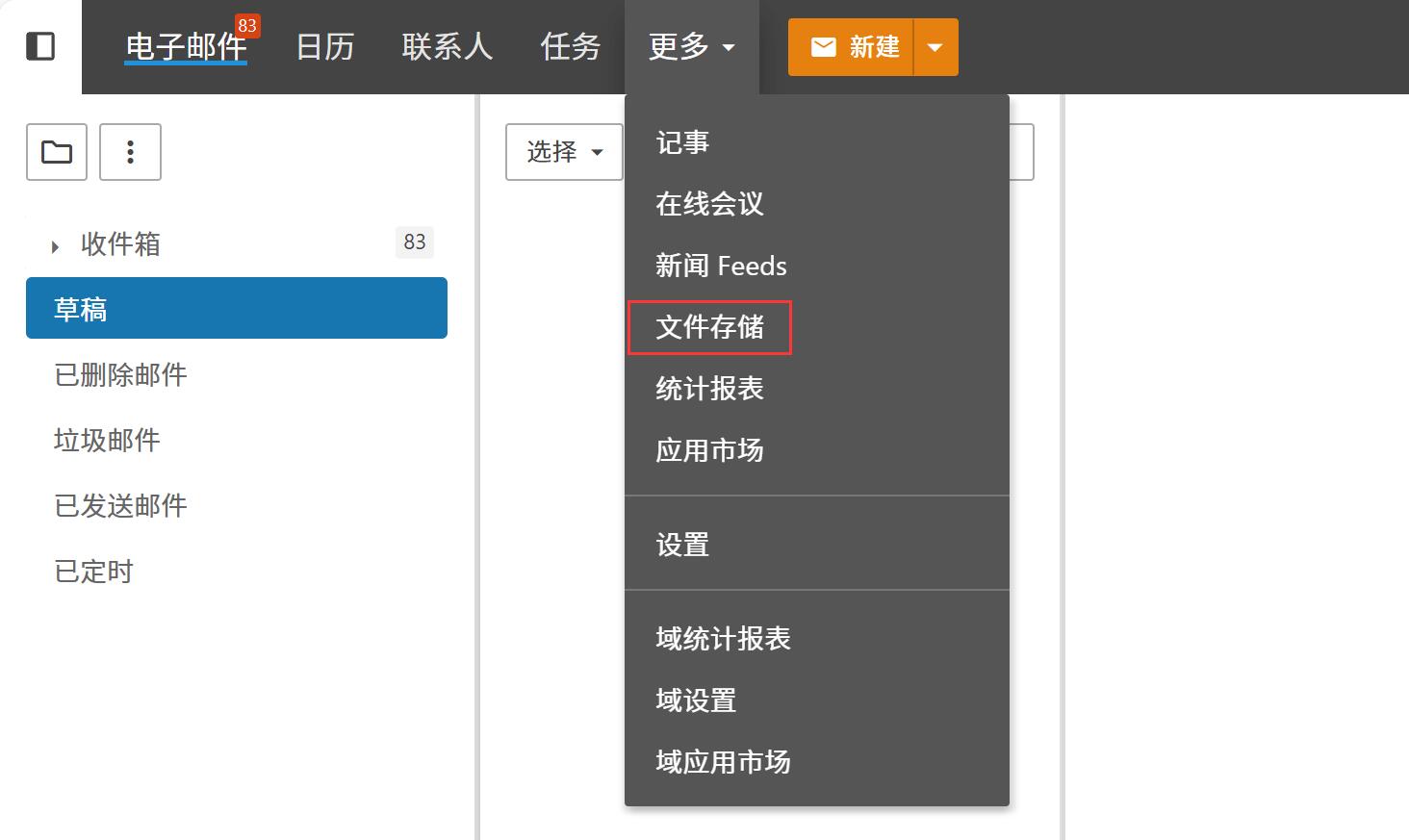 1、登录Webmail网页邮箱,依次点击[更多]-[文件存储]选项