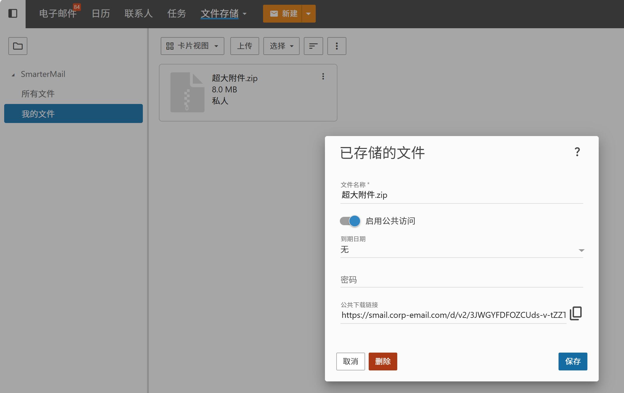 通过网页邮箱[文件存储]功能,可以上传和发送最大1GB的超大附件,且可以对附件设置有效期和密码。