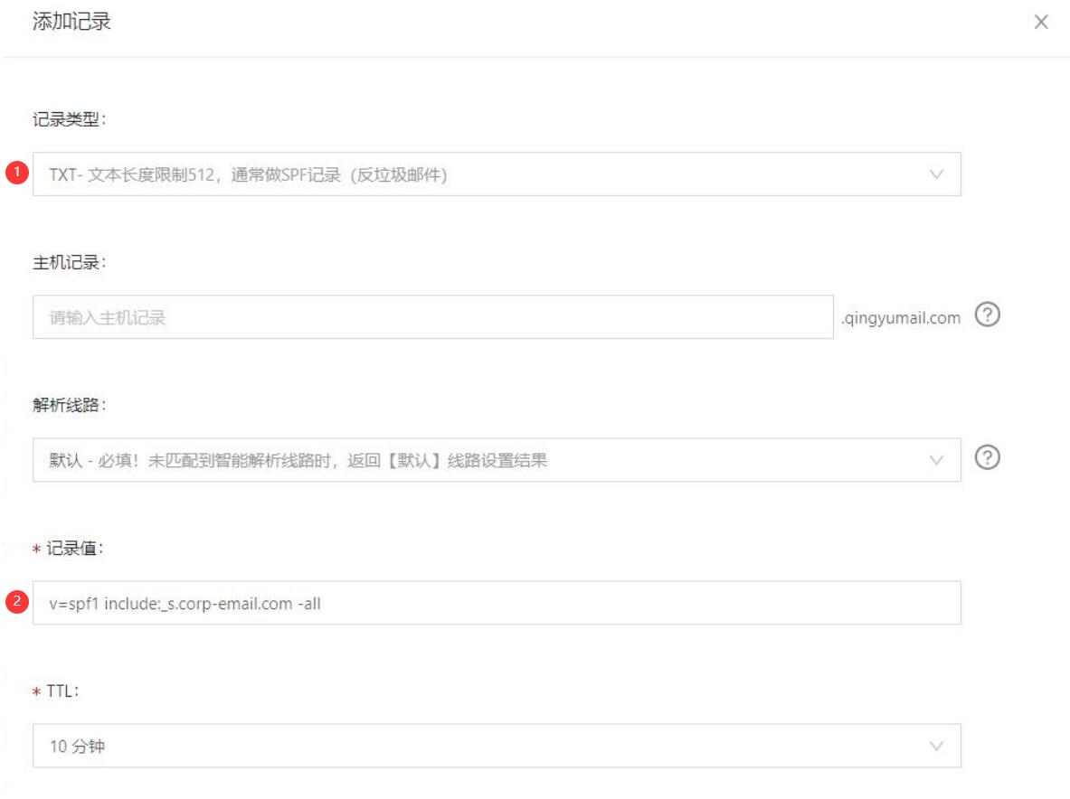SPF/TXT记录值:v=spf1 include:_s.corp-email.com -all