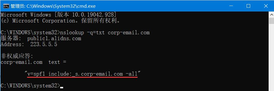 打开CMD命令窗口,输入nslookup -q=txt corp-email.com(替换corp-email.com为贵司域名)回车,如出现下面红线所示,说明SPF记录设置成功。