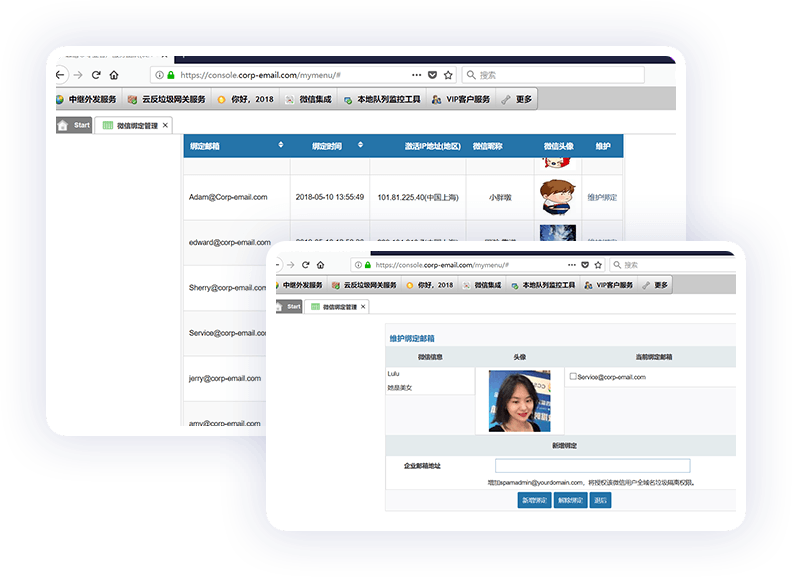 新增小彩蛋:日志系统管理员可以在后台增加多个邮箱绑定用户微信,并可以指定域垃圾邮件隔离管理员,查看和放行全域下的垃圾邮件。