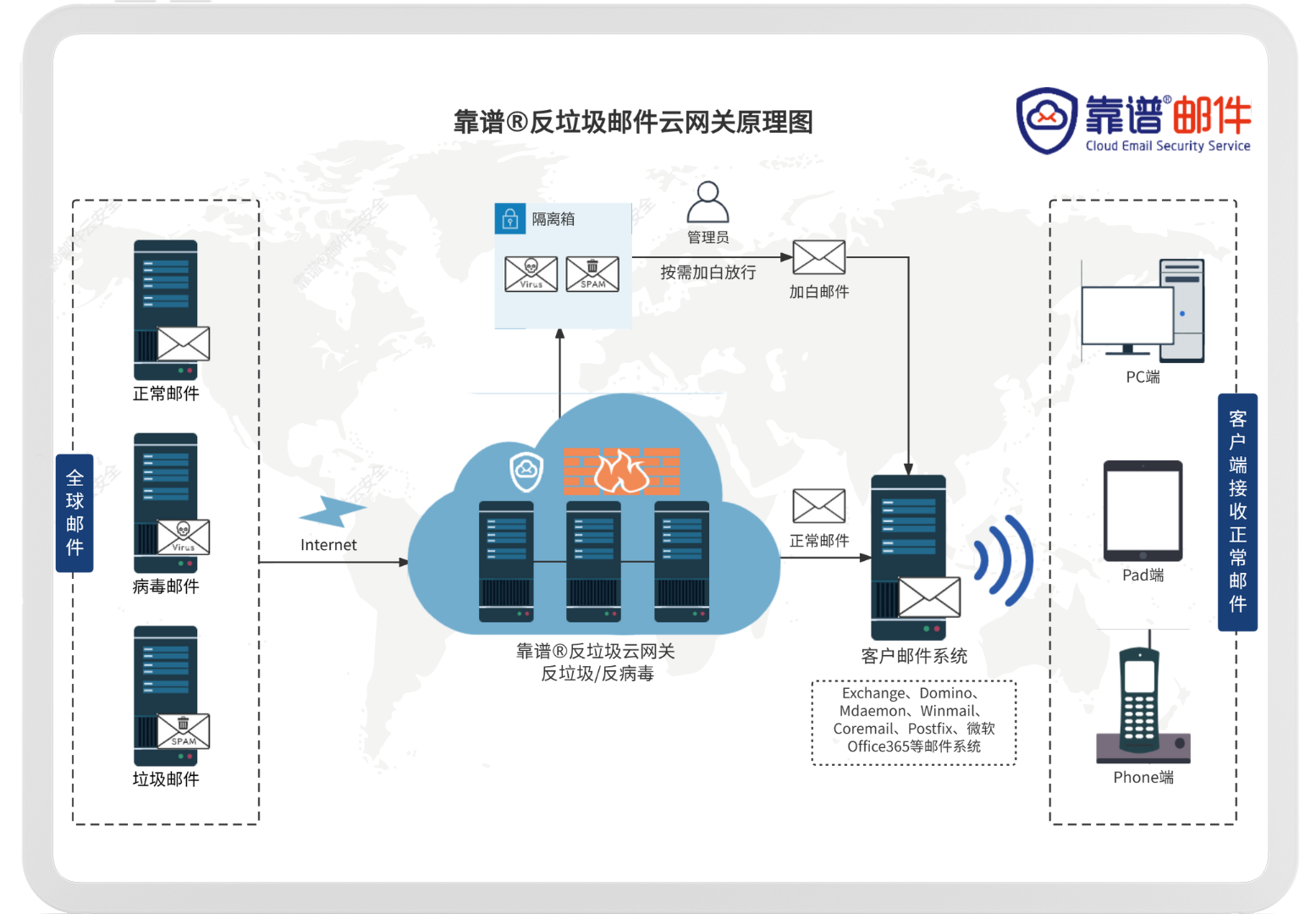 靠谱邮件反垃圾网关可与局域网内部的邮件系统(如Exchange、Domino、Mdaemon、Winmail、Coremail、Postfix、微软Office365等)进行集成,为客户邮件服务器提供反垃圾、反钓鱼、反病毒安全邮件网关服务。