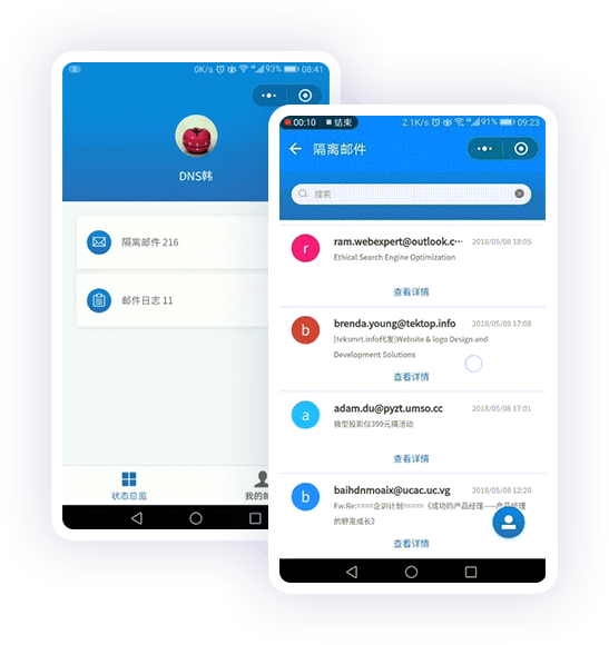 通过自助的邮件日志查询管理系统,管理IT随时了解和查询邮件入站状态(成功/失败);IT可以查看垃圾邮件隔离箱,及时加白或释放误判的邮件。独有的“靠谱邮件日志”微信小程序,让每个用户自行查看和处理误判的邮件,降低IT的工作量。