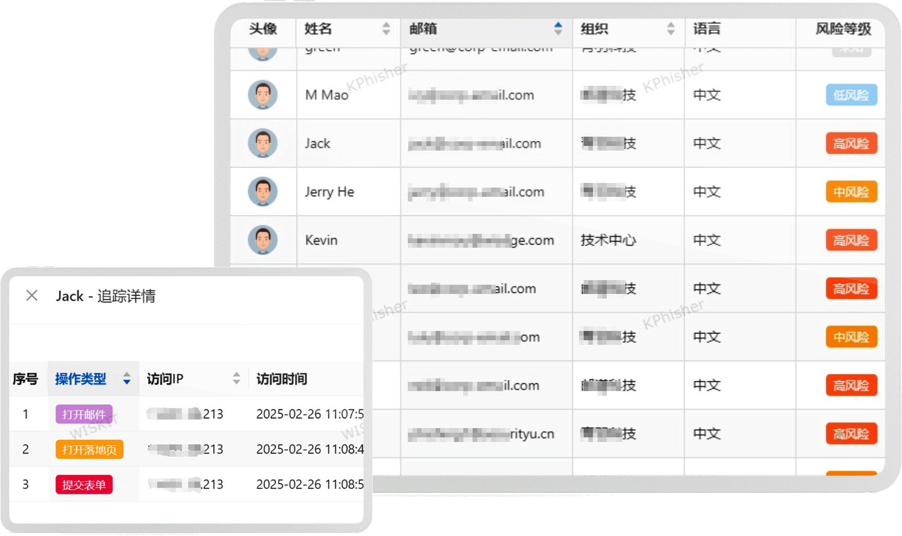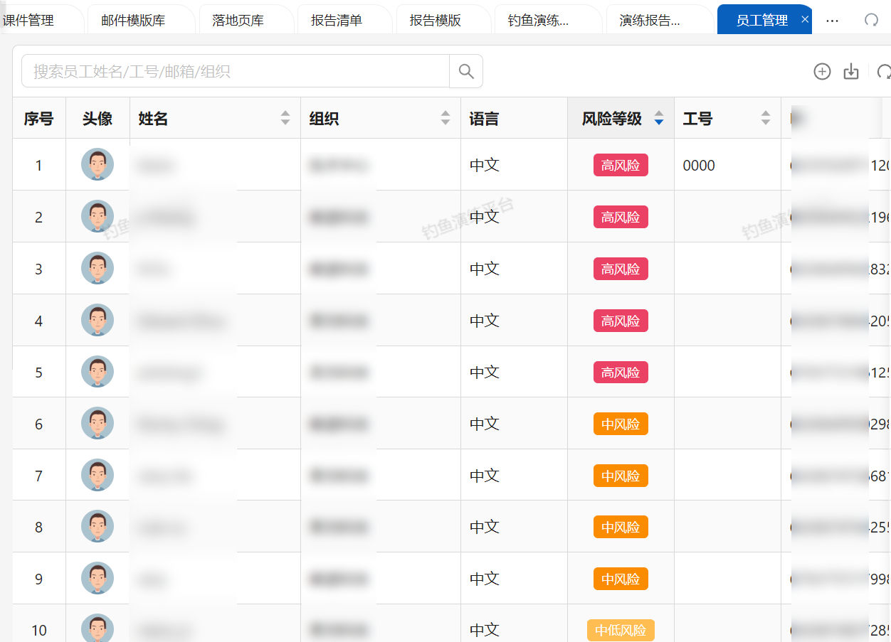 钓鱼邮件演练结果可追溯到员工个人,全链路记录参与演练员工在钓鱼演练中的操作行为数据(如点击、下载附件和提交敏感信息等),可视化展示员工个人安全风险意识等级。