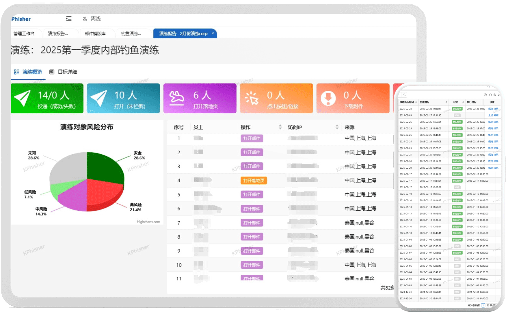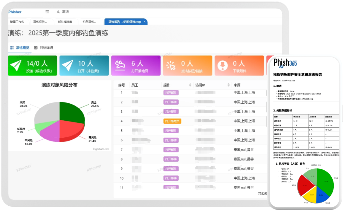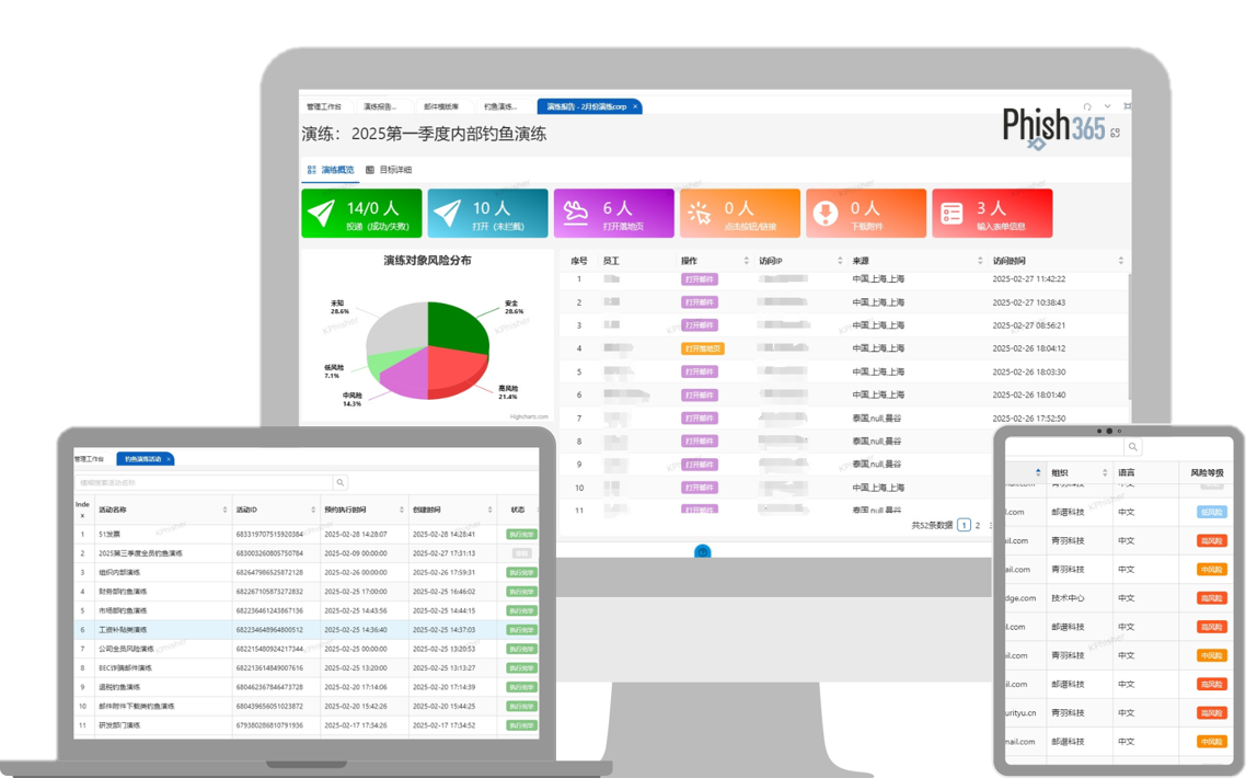 “Phish365钓鱼邮件演练平台”通过开箱即用的网络钓鱼模板,多维度模拟黑客网络钓鱼的手段,对内部员工实施有针对性的模拟钓鱼邮件演练活动,并通过安全意识培训课程,提升员工安全意识和识别钓鱼邮件的能力,从而防范网络钓鱼和商业邮件欺诈,降低企业数据和财产损失风险,助力企业构建人力防火墙!