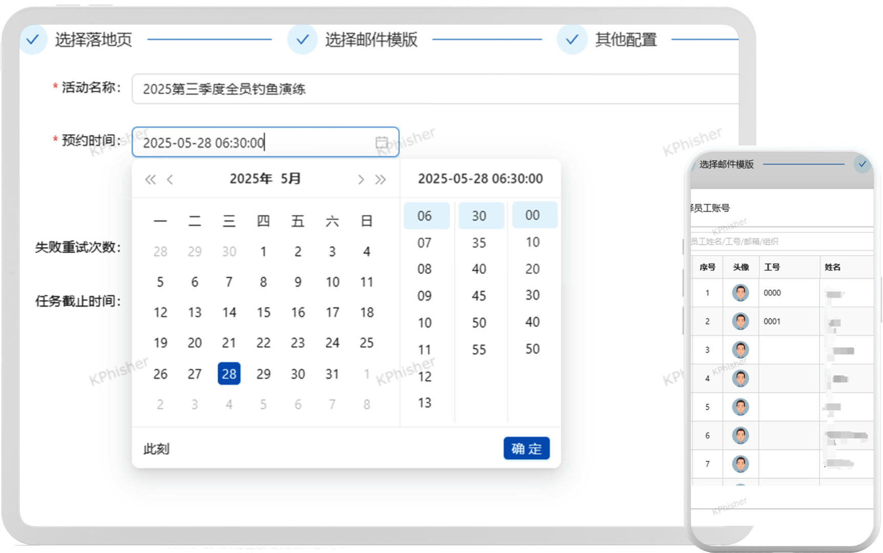 支持企业按部门、岗位、员工级别制定不同的钓鱼邮件演练计划,企业可根据自身企业特点,定制个性化的钓鱼演练计划与钓鱼邮件模板,在特定的时间预约发送钓鱼演练,以便钓鱼演练更加具有针对性,保障演练效果。