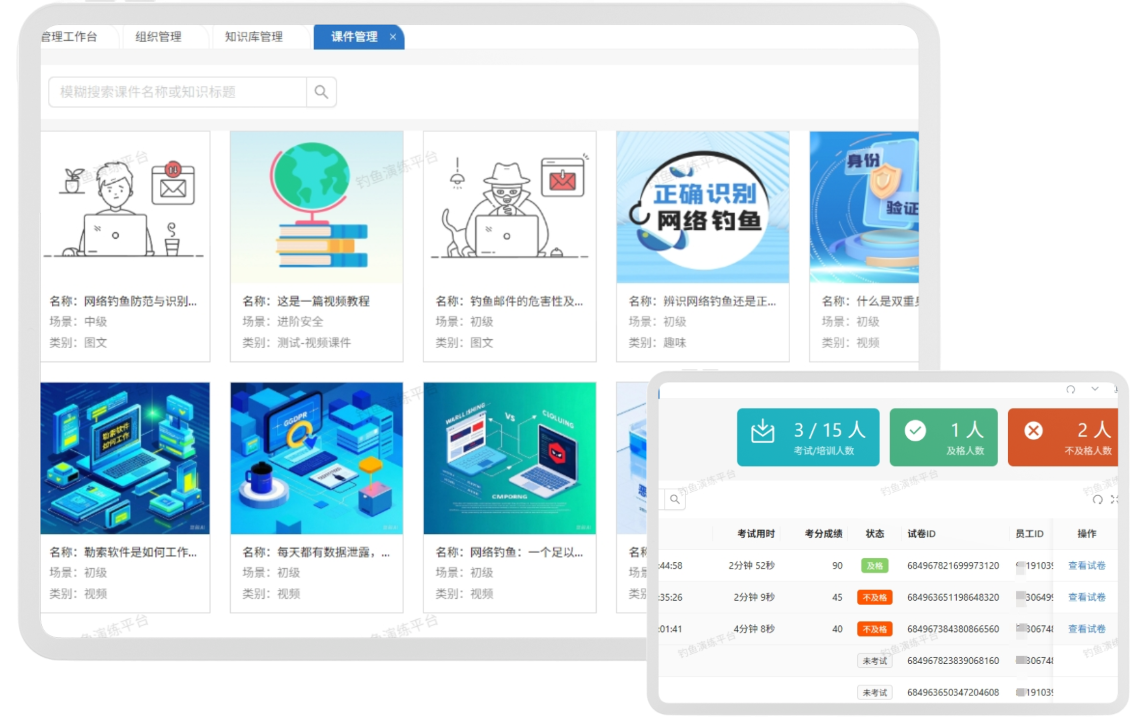 针对在钓鱼演练中“中招”的风险员工,演练平台提供有丰富的安全意识培训课程(课程形式包括课件、视频等)且后台持续更新,管理员可针对“风险用户”,发送有针对性的安全课程,后台支持实时追踪用户的学习进度与考核得分,考试及格的员工风险等级也会同步变化,安全培训效果一目了然。